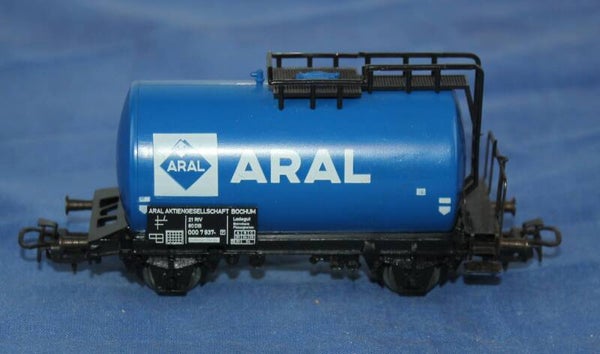 Blauwe tankwagon met vignet en opschrift “Aral”. Met bordes en laadplatform Opschrift o.a. Aral Aktiengesellschaft Bochum 80 DB 000 7 937. In goede staat.