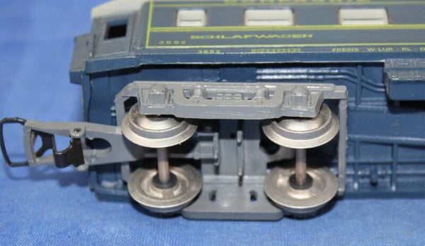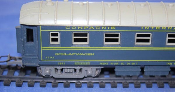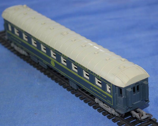 Donkerblauwe schlafwagen/ sleeping-car met Wagon Lits opschriften.