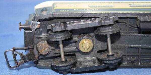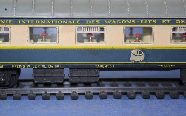 Blauw/ beige rijtuig, gele striping, grijs dak.