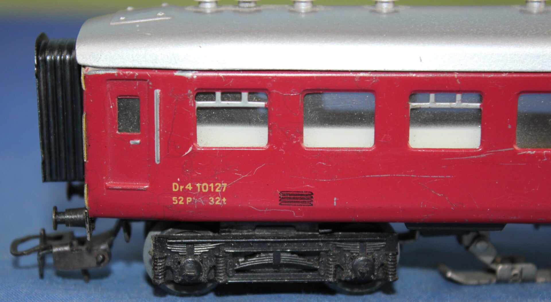 Rood met zilverkleurig dak, zwarte draaistellen.