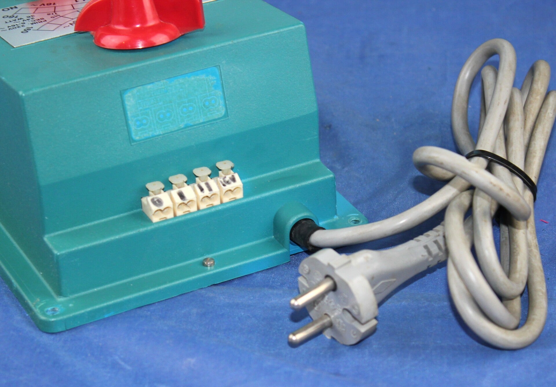 Robuuste trafo met kap van kunststof (verkleurd).