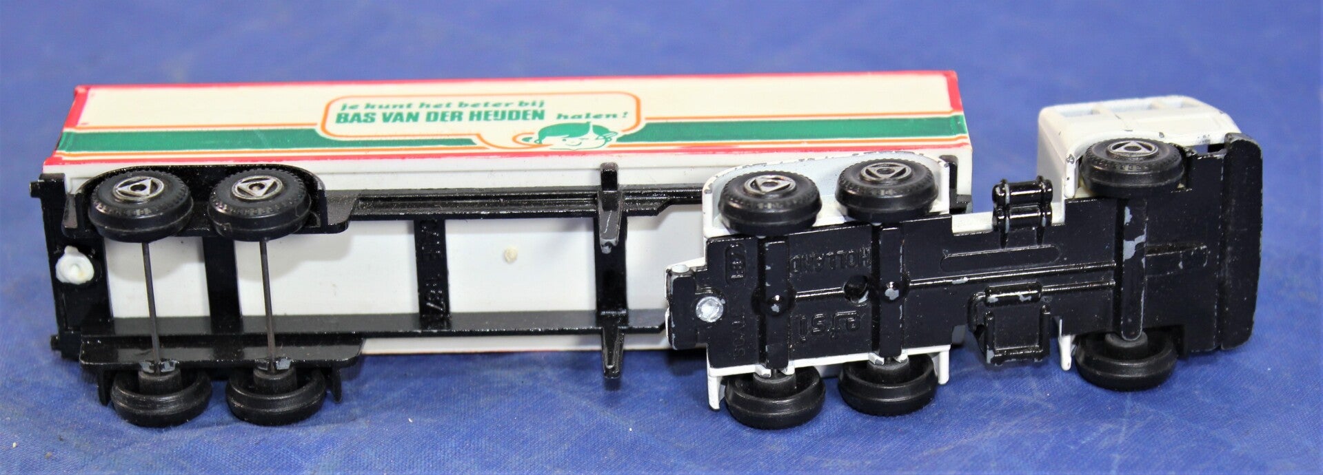 Wittetruck en oplegger op zwarte frames en witte opbouw.